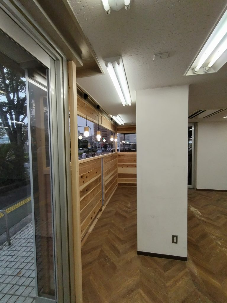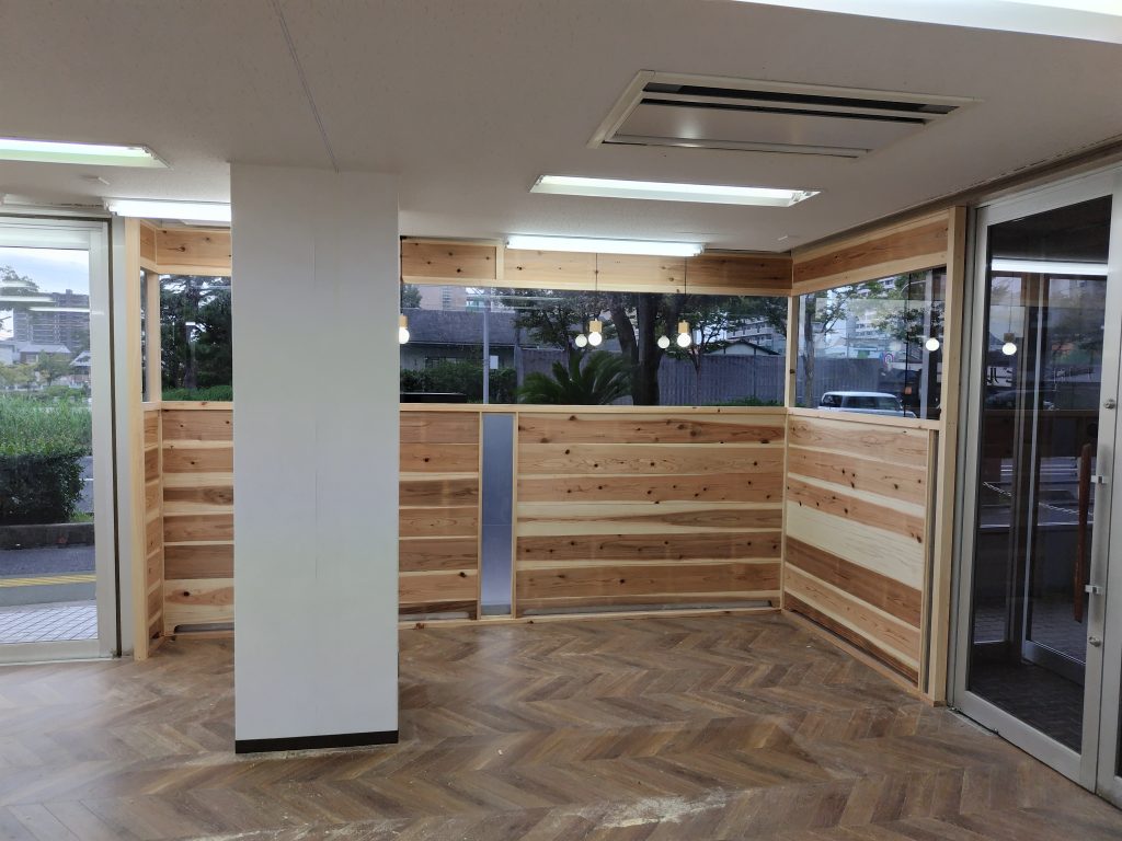 通りに面したガラス一面の壁をほどよく目隠し 大工さんこんな事も上手です